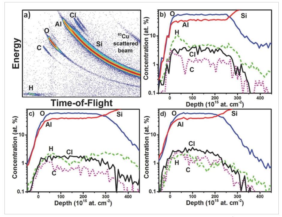 圖3:在ToF-ERDA測量中,可以通過測量每個反沖原子的飛行時間和能量來分離不同的質(zhì)量。Al2O3膜的元素深度分布:b)用7秒臭氧脈沖時間沉積時,c)用20秒臭氧脈沖LT+HT處理后,以及d)用7 s臭氧脈沖LT+T處理后。a) 與(c)中的深度剖面相對應的直方圖。該膜在200°C下以400次ALD循環(huán)沉積。注:由于直方圖中Al和Si在Si/Al2O3界面處的截面重疊,因此將Al和Si的深度分布繪制為一體。