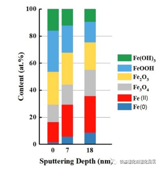 我們的鐵基催化劑與其他催化劑不同,不是通過“浸漬”、“燒結(jié)”等工序制備的;而是通過在液相中迅速氧化,使鐵刨花表面形成致密γ-FeOOH膜(當然是相對的,詳見XPS蝕刻表征圖,表面以Fe(III)為主),成為臭氧分解的催化層;同時,它又是內(nèi)部Fe(0)氧化的鈍化層。這種制備方法優(yōu)點:一是工藝簡單,一步完成;二是表面主要成份為γ-FeOOH,催化臭氧效果好。而燒結(jié)方法,表面不會形成過渡金屬羥基化物(Me-OH),理論認為:表面羥基(-OH)才是催化臭氧的有效官能團。