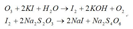 方法原理:一般采用化學(xué)碘量法。利用臭氧與碘化鉀的氧化還原反應(yīng),置換出與臭氧等當(dāng)量的碘。再用硫代硫酸鈉與碘作用,以淀粉為指示劑,待完全反應(yīng)生成無色碘化鈉。根據(jù)硫代硫酸鈉的消耗量計算出臭氧濃度。其化學(xué)反應(yīng)方程式如下: