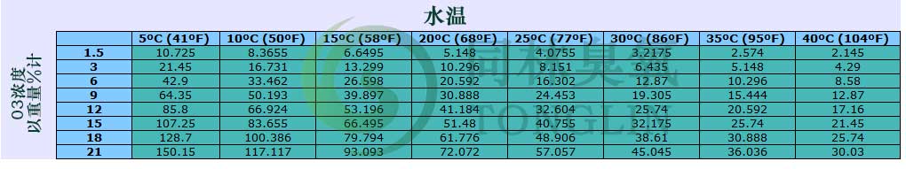 下表顯示了基于水溫和臭氧濃度的臭氧在水中的溶解度(以重量%表示)。這些是業內 很常用的值,并提供了一個簡單的參考工具。