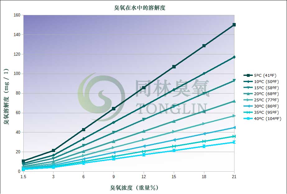 該圖表顯示了溫度和臭氧濃度對臭氧在水中溶解度的顯著差異。這表明水溫的微小變化可能在溶解到水中的潛在臭氧產生很大差異。此外,臭氧濃度的變化(干燥空氣與氧氣)將顯著改變臭氧溶解度。