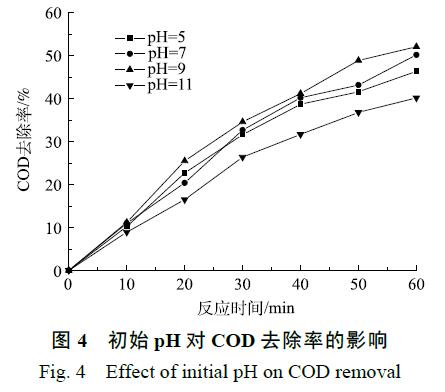 實驗選取了 4 個不同的 pH,用 NaOH 調節廢水 pH,臭氧催化氧化時間為 60 min,臭氧的投加量為 300 mg·L−1。由 圖 4 可知,初 始 pH 對臭氧催化氧化降 解COD 的影響較大,隨著 pH 的升高,COD 的去除率呈上升趨勢,當初始 pH 從 5 升到 9 時,COD 的去除率從 46.4% 升至 52.1%。臭氧間接氧化較多發生在中、堿性條件下,臭氧在堿性條件下很不穩定,易促進其自身分解[18],可通過自發的一系列鏈式反應生成強氧化性的·OH[19],更有利于 COD 的去除。此外隨著廢水pH 的升高,水中 OH−濃度增加,加劇了臭氧分解產生·OH。