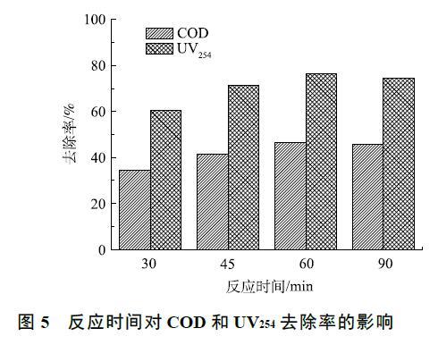 臭氧催化氧化實驗在室溫下進行,在廢水初始 pH 為 5,通過調節臭氧進氣濃度控制臭氧投加量為 300 mg·L−1 的條件下,考察了臭氧催化氧化時間對有機物去除效果的影響,結果如圖 5 所示。當反應時間從 30 min 增至 60 min 時,COD 和 UV254 的去除率分別從 34.6%、60.4% 升高到 46.4%、76.3%,有機物的去除率隨反應時間的延遲而增加。這是由于·OH 在水中的壽命很短 [22],大約 為 10−9  s,臭氧催化氧化中·OH 氧化反應實際發生在催化劑周圍,在傳質不充分的反應條件下,部分·OH 在未知有機物發生反應之前就已經被淬滅。當臭氧催化氧化時間縮短時,單位時間內臭氧投加量加大,產生的·OH 增多,導致大量·OH 未參與反應就淬滅,從而導致有機物去除率下降。當反應時間到達一定的臨界點時,再延長反應時間,其去除率增加不再明顯,臭氧催化氧化反應從 60 min延長至 90 min 時,COD 和 UV254 的去除率基本不變。