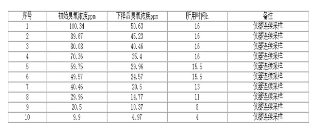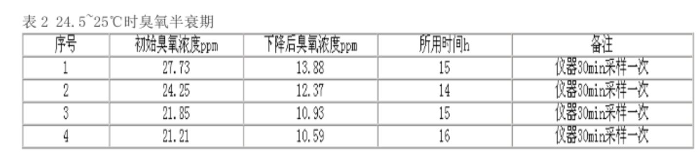 比利時(shí)臭氧專(zhuān)家W·J·馬舍蘭在《臭氧雨水的接觸和接觸器尾氣處理》文中認(rèn)為:臭氧在霧中的半衰期約為4~5h。國(guó)內(nèi)外一些臭氧資料中的半衰期相距很大。為此,我們用一容積為0.95mg/m3的玻璃柜,在環(huán)境溫度為20~25℃;環(huán)境溫度為60~80%Rh,臭氧濃度在200ppm以下的情況下做了一些實(shí)驗(yàn),現(xiàn)將結(jié)果抄錄如下。