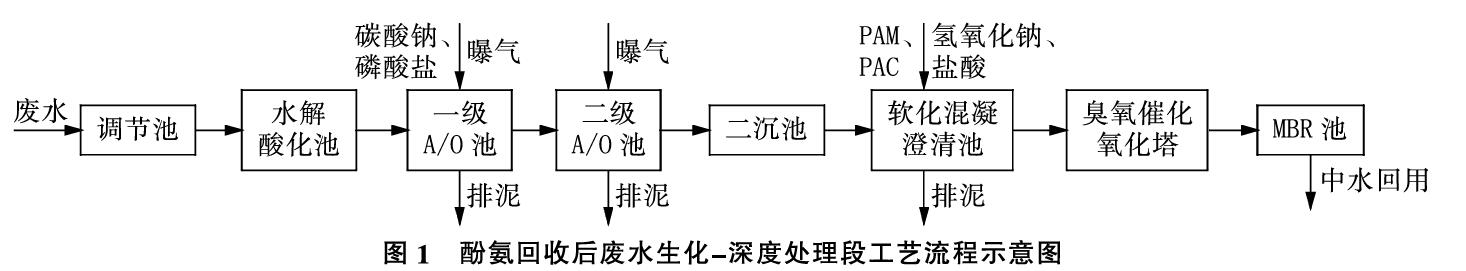 從表1水質分析可知,廢水具有高COD、高氨氮、高酚等特點,因此一級處理采用水解酸化+生化A/0工藝:采用水解酸化工藝,可降解大分子有機物,提高B/C值;在A/0池中采用混合液和污泥回流的前置反硝化工藝,可在降解有機物的同時,將氨氮轉變為硝酸鹽、亞硝酸鹽,在反硝化過程中再轉化為氮氣。經過生化處理后的廢水,污染物主要為難以降解的大分子,增加了深度處理的難度,因此深度處理采用臭氧催化氧化+MBR工藝:采用臭氧催化氧化的方式,打破大分子鏈,轉變為可降解的小分子;同時采用MBR工藝,攔截大分子有機物和活性污泥,增加有機物的降解時間,保障出水水質。酚氨回收后廢水生化-深度處理段工藝流程示意圖見圖1。