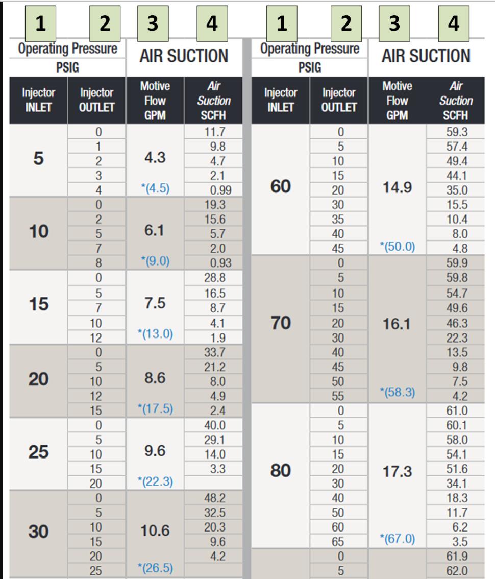 很后一欄稱為空氣吸力,列出了在這些對齊的射流器入口/出口壓力下可以吸入水流的氣體(氧氣,臭氧,空氣)的數(shù)量。