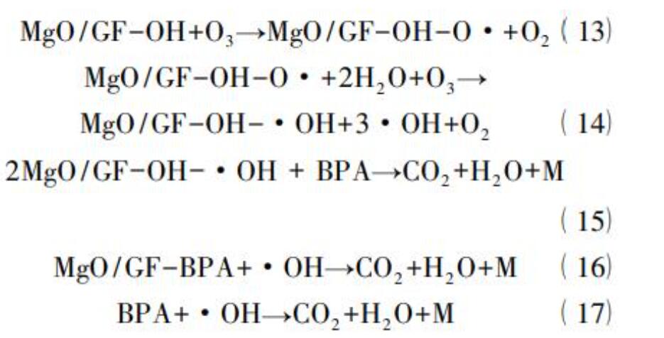 Zhang等利用高比表面積、可折疊的石墨氈(GF)為載體,采用等體積浸漬法制備了MgO/GF催化劑。在中性條件下降解雙酚A(BPA)的過程中發(fā)現(xiàn),與單獨(dú)臭氧化過程相比,加入MgO/GF催化劑可以使BPA和COD的去除率分別增加40.0%和31.6%。通過加入羥基自由基猝滅劑———叔丁醇,間接證明了MgO/GF/O3體系主要遵循羥基自由基的反應(yīng)機(jī)理。同時(shí)對反應(yīng)過程中溶解臭氧濃度進(jìn)行檢測,發(fā)現(xiàn)加入催化劑后溶液中的臭氧濃度始終處于較低水平。因此,作者認(rèn)為MgO/GF可以提高臭氧化效率的原因主要是催化劑表面的堿性位可以促進(jìn)臭氧分解產(chǎn)生·OH,如下述方程式所述。