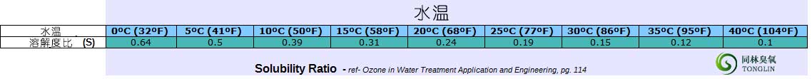 當臭氧溶解在液體中時,  亨利的定律得到了密切的遵守。因此,必須確定飽和比(溶解的氣體體積/液體體積)。根據臭氧的飽和比,臭氧的溶解度可表示如下: