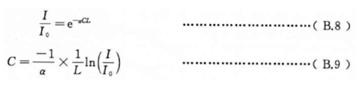 臭氧對254 nm 波長的紫外光有特征吸收。臭氧化氣樣品和參比氣體( 不含臭氧的空氣或氧氣)分別以恒定的流速進入儀器的吸收池,參比氣通過吸收池時,被光檢測器檢測的光強為I0,樣品氣通過吸收池時被檢測器檢測的光強為I 0。I / I 0 為透光率。儀器的微處理系統根據朗伯- 比爾定律計算出臭氧濃度,這些量之間的關系表示為式(B.8) 或式(B.9):