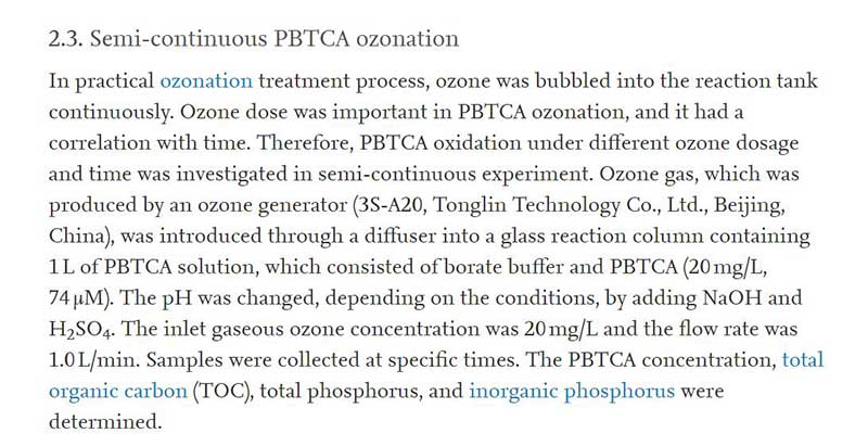 清華大學(xué)環(huán)境系使用同林臭氧發(fā)生器進(jìn)行水處理實驗,撰寫了關(guān)于臭氧化降解2-膦酰丁烷-1,2,4-三羧酸(PBTCA):動力學(xué),磷轉(zhuǎn)化,抗沉淀性能變化和除磷的論文。
